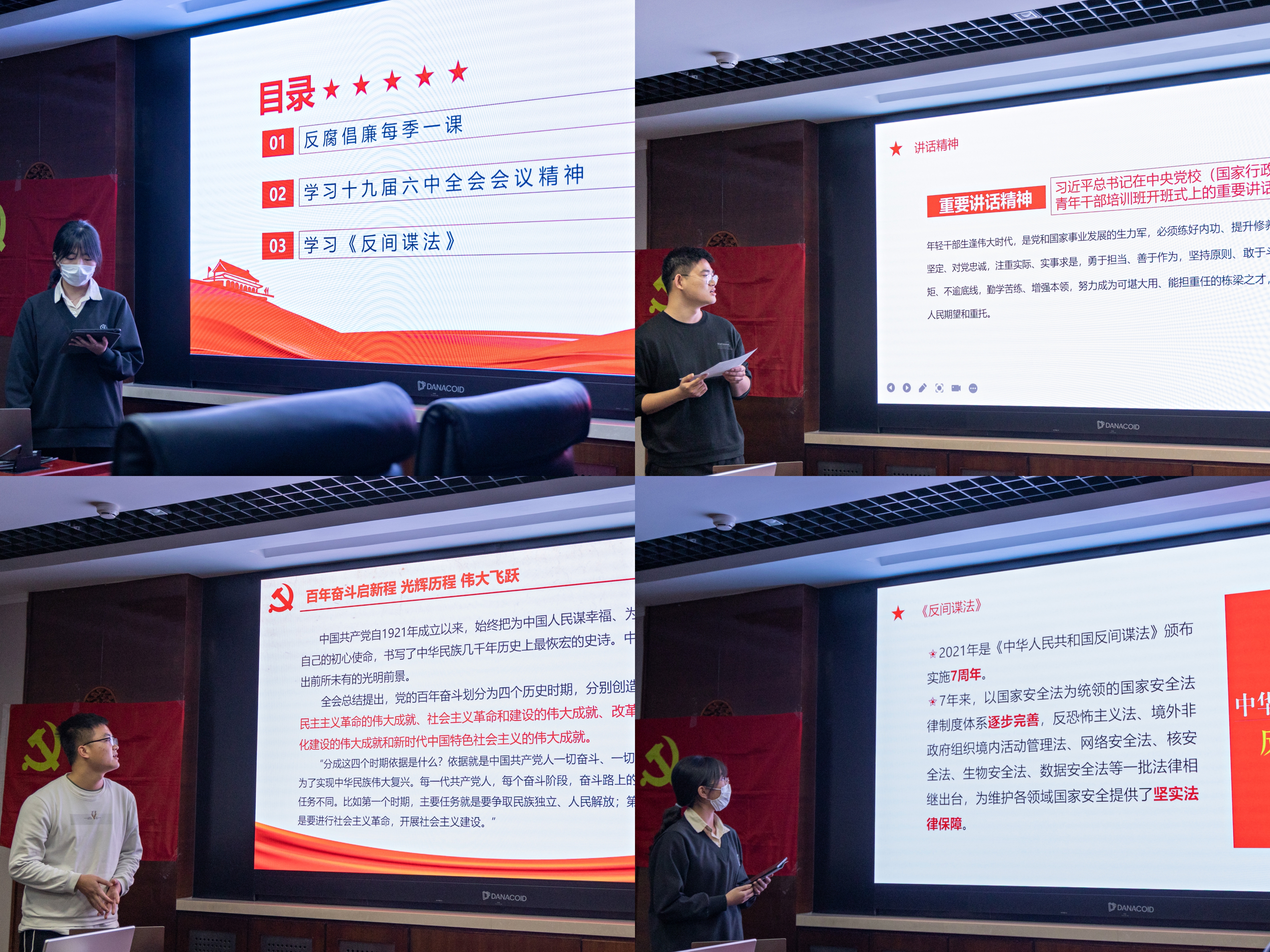首先,田雨和张文良同志组织大家进行反腐倡廉内容的集中学习,重点学习了《坚定理想信念,补足精神之钙》、习近平总书记在纪念辛亥革命110周年大会上的重要讲话,并据此强调学生党员应当坚定理想信念,磨练意志,在实践中贴近群众;严守思想防线,及时反思和纠正自身思想和行为中的问题。