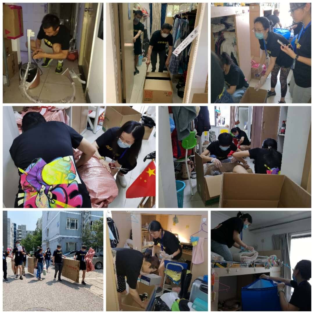 平日里文静的女老师们在行李打包中“巾帼不让须眉”,个个都铆足了力气,一刻不歇,同时也发挥了她们耐心细致的优势,将女生宿舍里的物品收拾的井井有条,干干净净。男老师们是这次行李打包工作中的主力,大运村男生宿舍空间紧凑,给打包工作增添了一些难度,但空间的狭窄并没有束缚他们热情和力量的释放,老师们脸颊上虽然流淌着汗水却也面带着乐观的微笑。