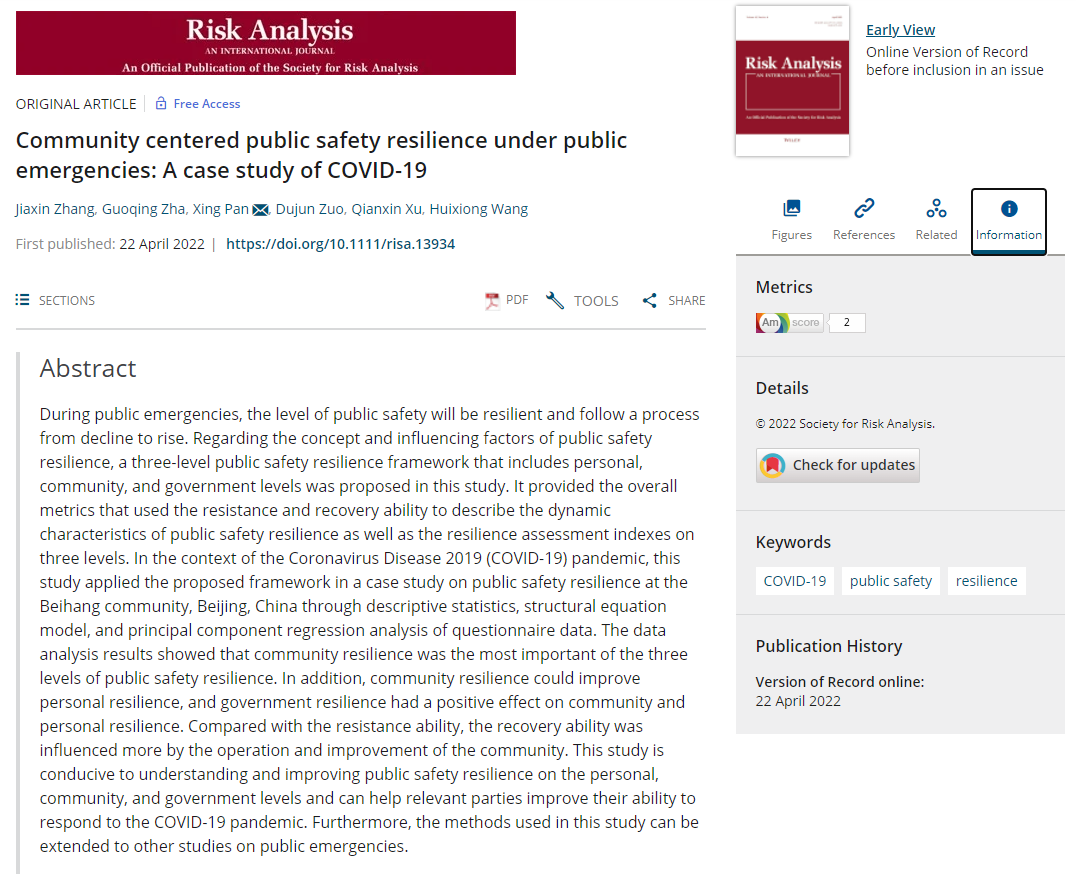 在疫情期间,北航永利集团304am登录“复杂系统韧性与体系工程”研究团队,将可靠性工程领域中韧性(弹性)理论用于公共安全分析中,建立了以社区为中心的突发公共事件影响下的公共安全韧性模型,并在2020年3月疫情期间采用实证数据进行分析。相关研究成果以“Community centered public safety resilience under public emergencies: A case study of COVID-19(公共事件下以社区为中心的公共安全韧性——以COVID-19为例)”为题,于2022年4月22日发表在风险学会会刊、风险领域Top1期刊(Q1,IF=4.000)、中国科协安全科学领域高质量科技期刊(T1级)Risk Analysis上。论文第一作者为硕士研究生张嘉欣,潘星教授为通讯作者。