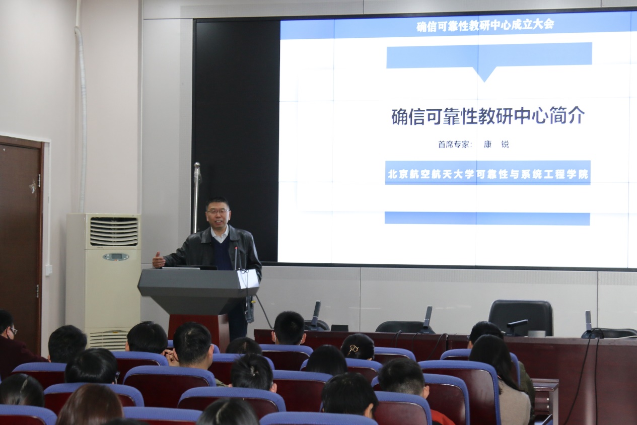 中心首席专家康锐致辞。他表示,确信可靠性理论自2012年正式提出,历经12年的理论探索建构与工程实践检验,形成了一套完备的可靠性科学研究方法与体系。中心的成立充分彰显了学院的认可与支持,也为团队创造了新的更高起点。他指出,展望未来,确信可靠性中心还有很长的路要走。中心将在人才培养、科研创新、社会服务、国际交流上深耕笃行、持续发力,聚焦前沿交叉领域,增强可靠性科学理论的影响力,以实际行动传承学院“为民精神”的宝贵精神财富,更好造福人类社会。