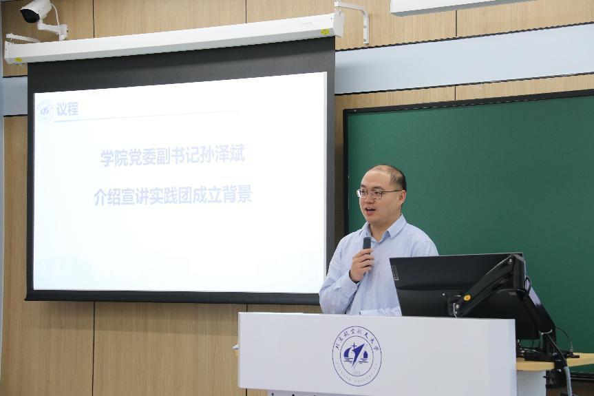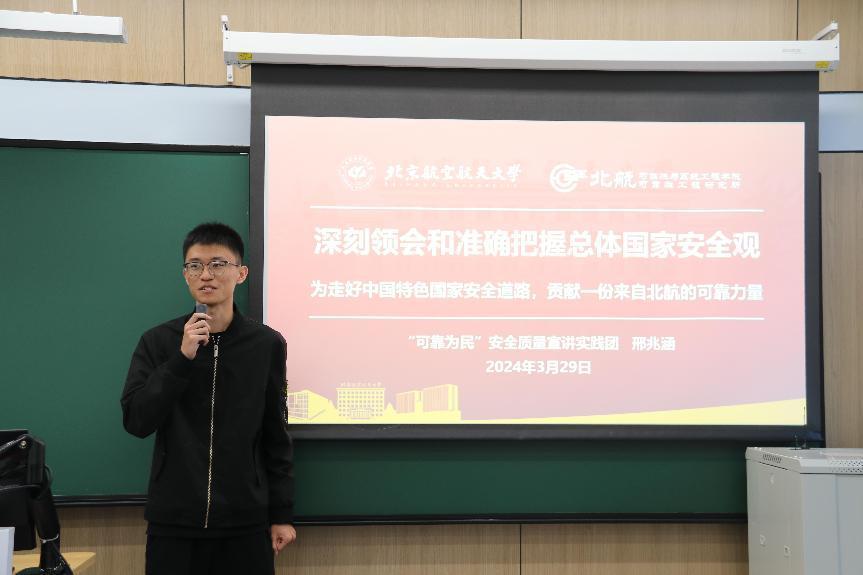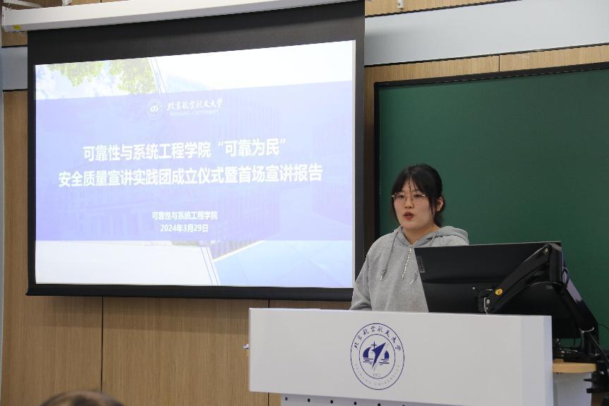 学院党委副书记孙泽斌介绍了宣讲实践团成立背景。“可靠为民”安全质量宣讲实践团面向大、中、小学生开展安全与质量科普知识课程体系,系统谋划以社会实践为牵引的“国家安全”“质量强国”情怀教育平台,整合学院已有优势资源,精心设计“可靠实践”系列活动,打造“可靠为民”铸魂育人辅导员工作室,统筹推进“可靠为民”空天报国宣讲团建设,培育一批具备安全质量意识的优秀北航学子,同时将安全质量教育贯通到中小学环节,增强社会影响力。