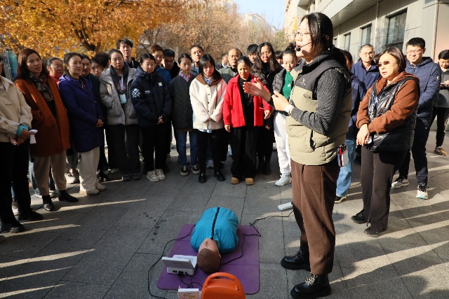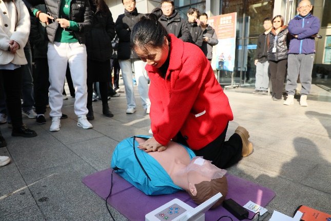 演练现场还设置了消防知识宣传区,通过展板,向师生们普及了火灾预防、初期火灾扑救、火场逃生自救等消防安全知识。演练结束后由中湾物业消防部门经理王肇晨现场演示了灭火器和自滤式呼吸面罩的正确使用方法,并邀请师生们亲自操作,加深了大家对消防器材使用的理解。在心肺复苏急救培训环节,安全教育体验馆雷婷和付萌萌为大家讲解心肺复苏急救常识和急救技巧,让师生真正理解和掌握紧急救助能力,部分师生针对心肺复苏人进行了心肺复苏练习。