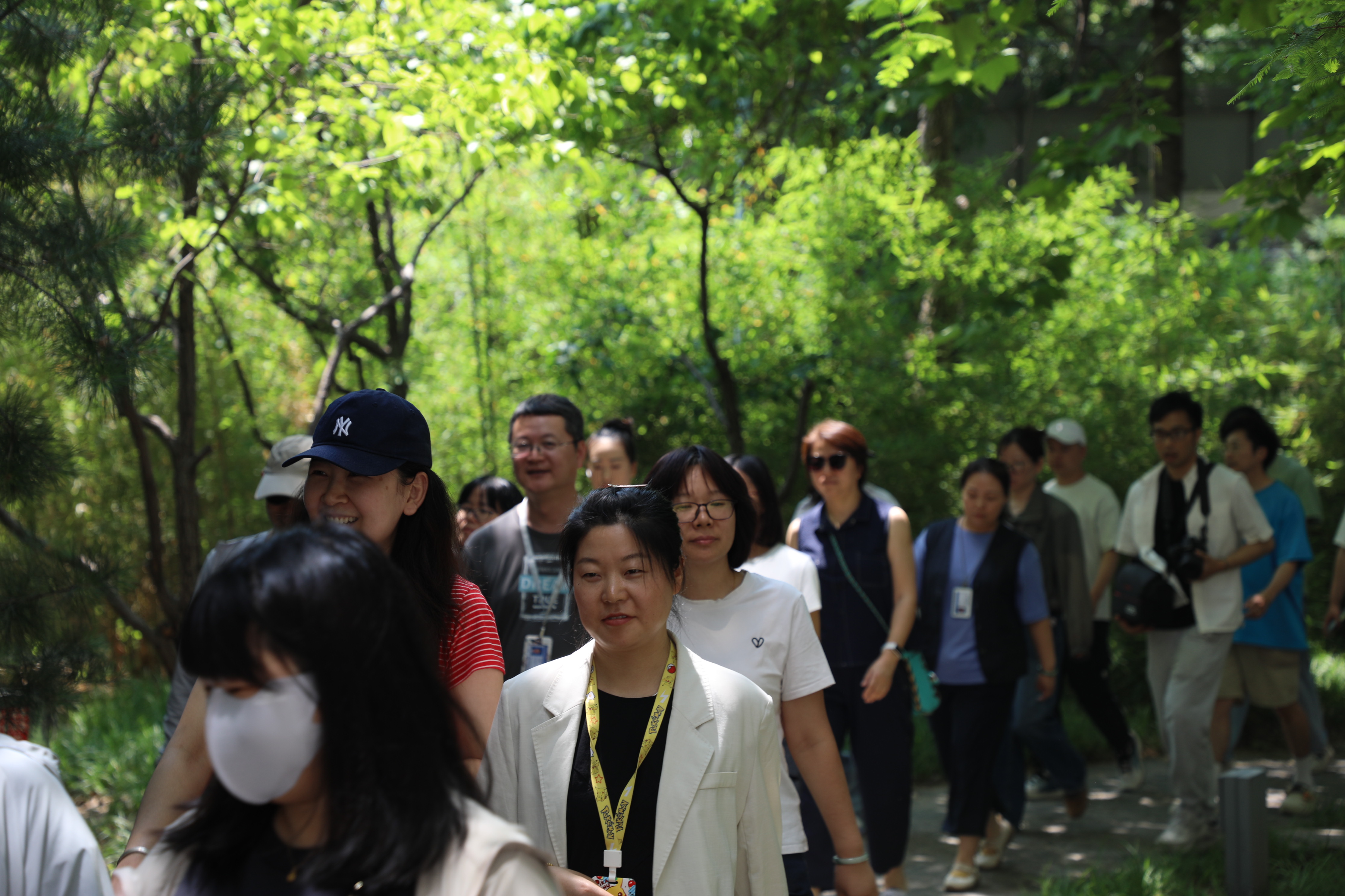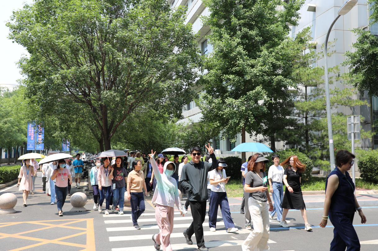 第二站,穿过新主楼建筑群,途经绿化园林,踏过砾石小径,或驻足仰望,或轻抚枝叶,老师们在静谧的绿荫中走向新主楼大台阶。