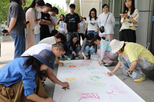 中午11点,老师们在为民楼前集合,围绕“踏歌拾光,步履诗行”主题展开艺术共创。活动现场,工会预先准备的十米长卷画布铺陈于地,老师们或执笔挥毫,或以色彩点染,将情怀与自然融为一体。